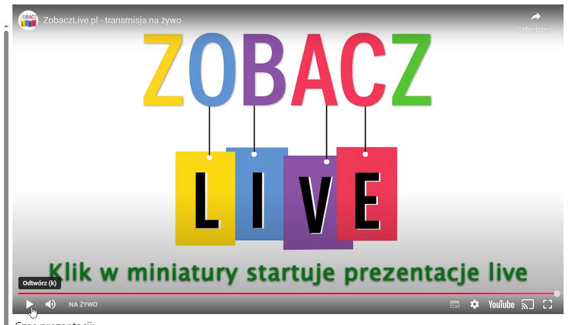 Uruchom player live Youtube, klikając w symbol "PLAY" lub powyżej czerwonej linii.. Typowe opóźnienie transmisji na żywo w serwisie wynosi 1-4 sekund i zależy od jakości Twego inernetu oraz sprawności urządzenia.